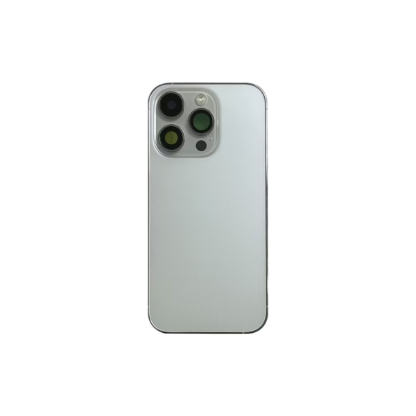 Complete rear housing with all small parts, excludes battery and back camera; Silver finish; compatible with iPhone 14 Pro (A2890/A2650/A2889/A2892).