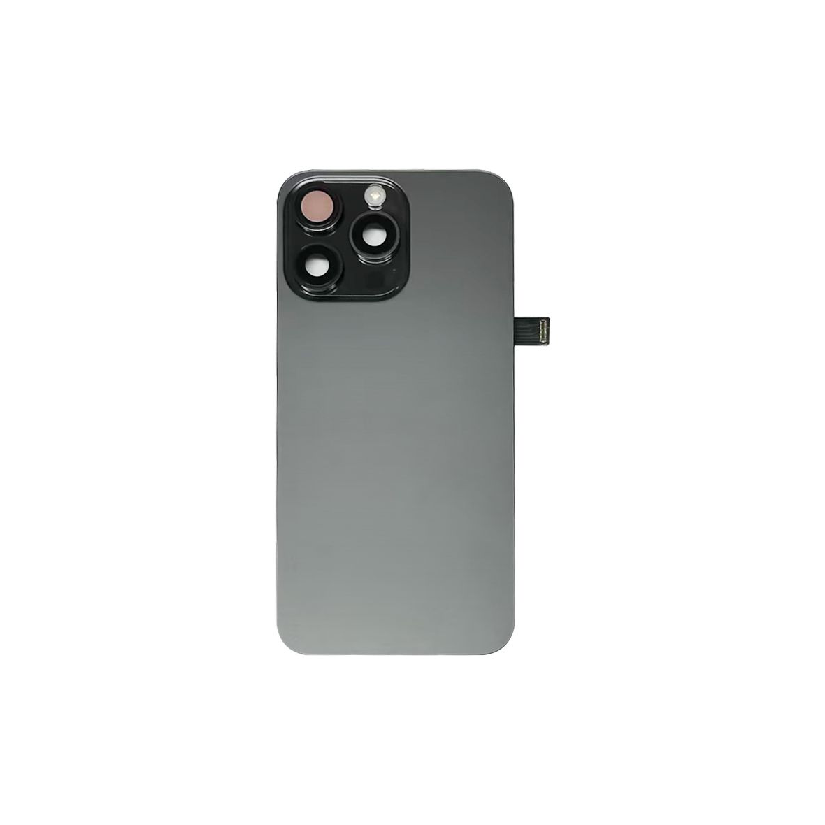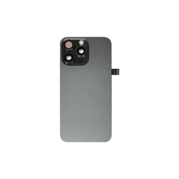 Complete rear housing with all small parts, excludes battery and back camera; Black Titanium finish; compatible with iPhone 15 Pro Max (A2849/A3105/A3106/A3108).